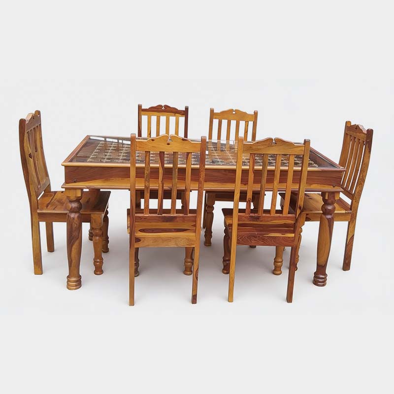 The glass-top surface enhances durability while showcasing the intricate detailing beneath, giving it a premium antique look. The six solid wood chairs are ergonomically designed with vertical slat backrests, offering both comfort and style for family meals and gatherings.
