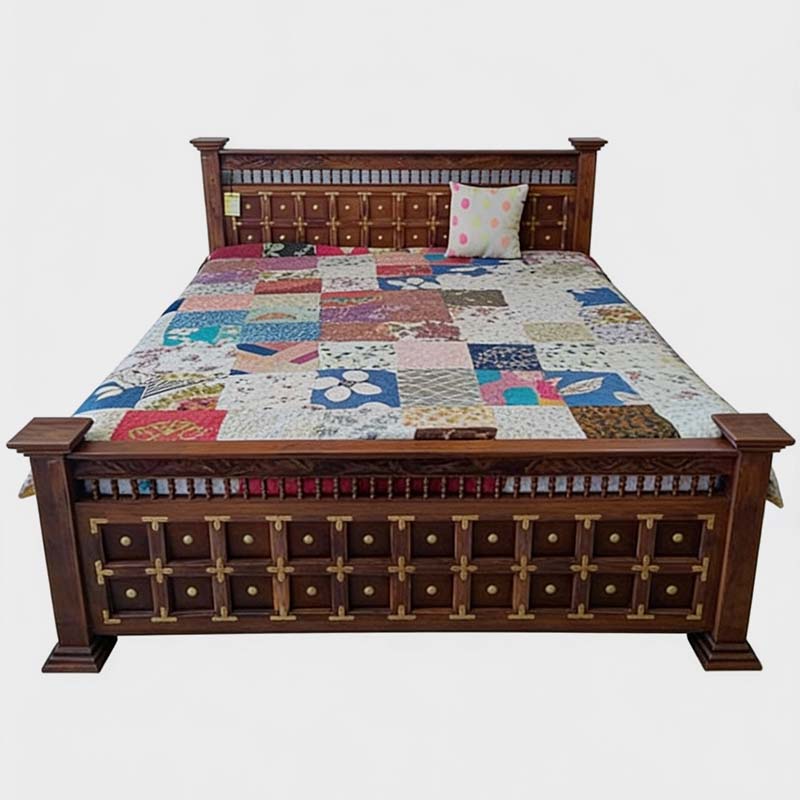 Bring timeless elegance and traditional craftsmanship into your home with the Antique Vintage Brass Panel Wooden Bed. Designed with intricate brass panel work and rich wooden finishing, this bed showcases the beauty of classic antique furniture while maintaining modern strength and durability.