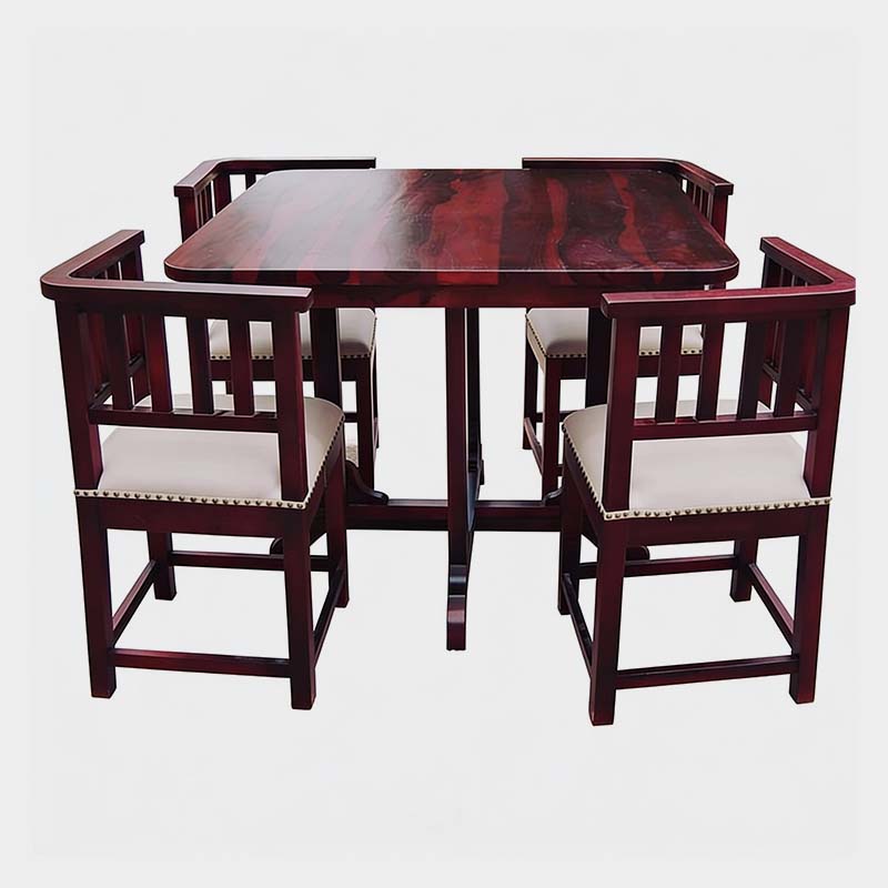 Crafted from high-quality solid wood, this vintage furniture dining set ensures superior durability and long-lasting strength. The dining table features a luxurious deep wooden polish that highlights the natural grain patterns, giving it a premium and sophisticated appearance. The matching four chairs come with strong wooden frames and comfortable cushioned seats, providing excellent support and relaxation during meals.