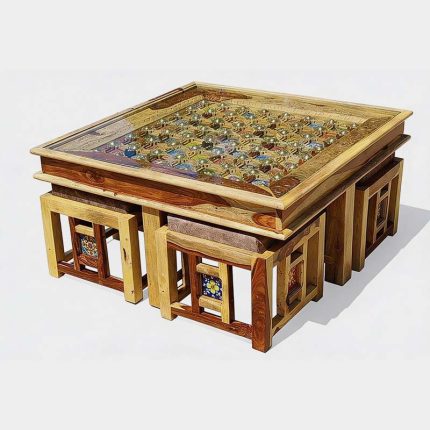 Transform your bedroom into a stylish and comfortable retreat with this beautifully designed Handcrafted Mosaic Design Wooden Bed. Expertly crafted using high-quality solid wood, this bed showcases excellent strength, stability, and long-lasting durability. The highlight of this bed is its stunning mosaic tile panel work on both the headboard and footboard, adding a vibrant artistic touch that reflects traditional craftsmanship.